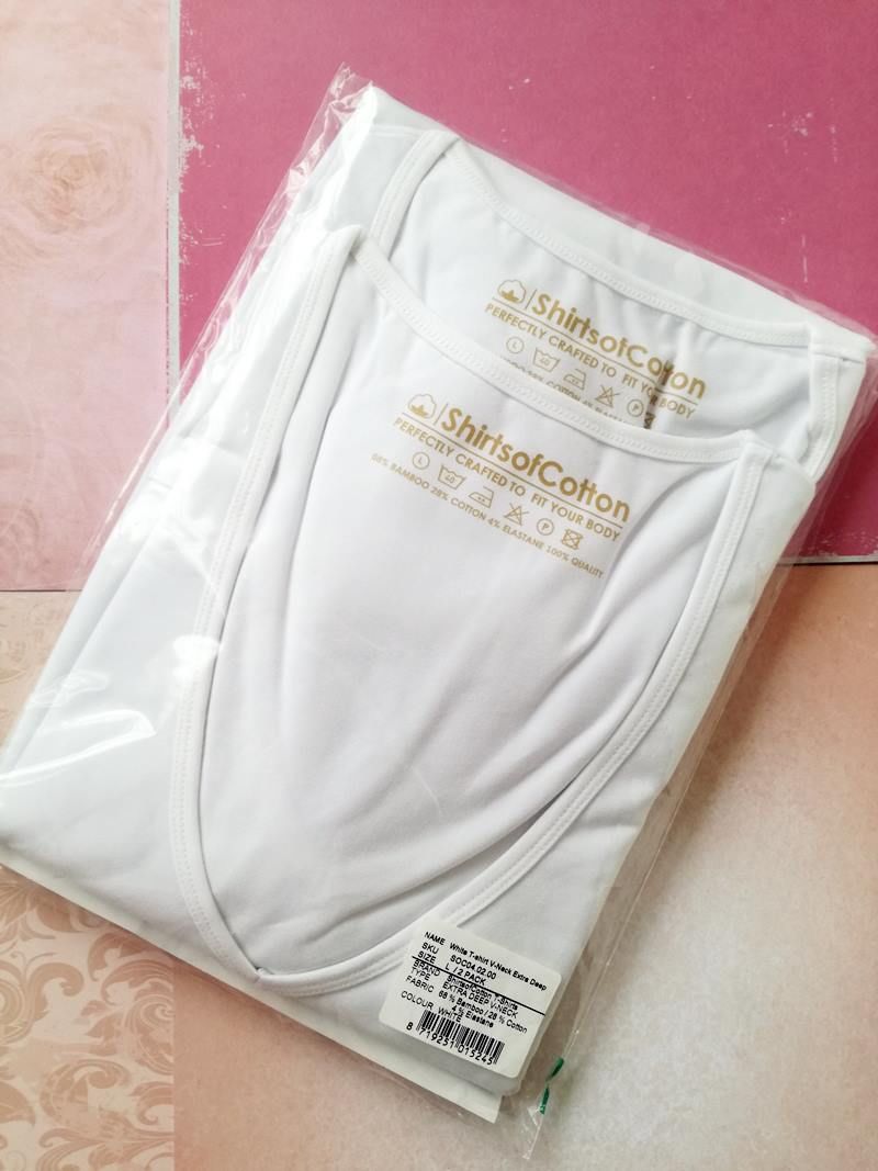 Ik hou van kleur maar als ik basic shirts koop dan ga ik altijd voor witte t-shirts. Ik hou ook niet van de printjes op t-shirts, omdat die vaak stug zijn en na enkele wasbeurten lelijk gaan vervagen. Ik kon kiezen uit setjes met een ronde hals, een basic V-hals, een medium V-hals en een diepe V-hals. Ik ging voor de diepe V- hals, omdat ik het fijner vind om mijn hals vrij te houden. In ieder geval liever niet iets wat strak aansluit, daar krijg ik het altijd een beetje benauwd van. Een losse sjaal draag ik wel graag, maar de boord van een kraag mag niet te strak aanvoelen. Eigenlijk heb ik niets in mijn garderobe die wat “decolleté” laat zien. Een beetje cleavage moet kunnen, toch?