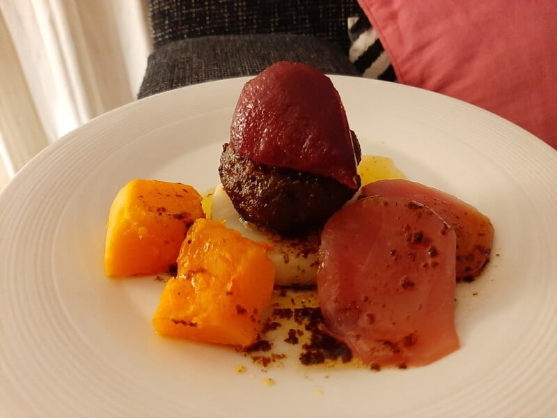 Verder zie je op de foto chioggia (tjokja) biet, venkel (ligt eronder), een stoofpeertje (ligt erbovenop) en flespompoen. Weet je dat ik tegenwoordig helemaal strak sta na zo een hapje? De laatste tijd krijg ik steeds minder naar binnen, naar een all-you-can-eat restaurant hoef ik niet meer te gaan. Twee punten pizza is ook meer dan genoeg terwijl ik vroeger met gemak een hele pizza naar binnen werkte. De leeftijd?