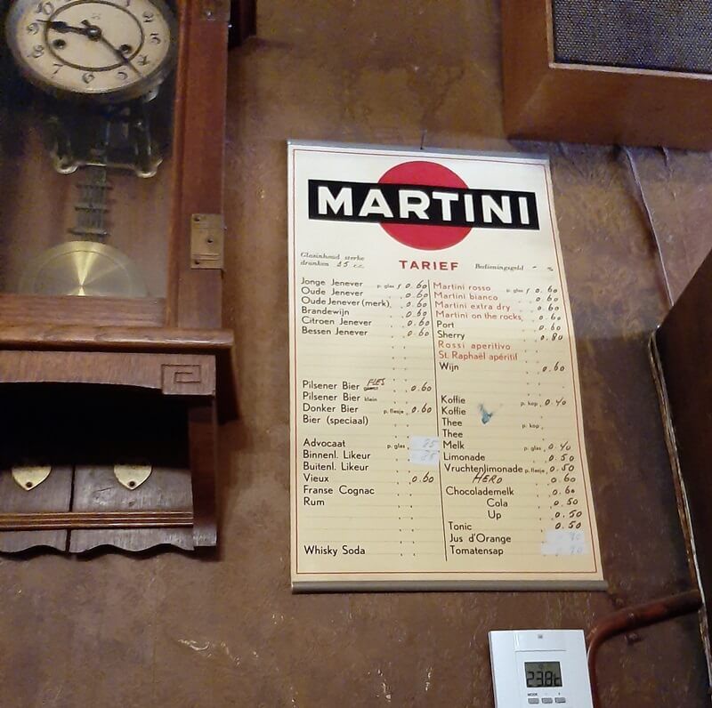 Ziet er wel heel leuk uit die ouderwetse dingen. En als je dan op die kaart kijkt in het café, dat je vroeger maar 60 cent (in guldens!) betaalde voor een Jenever bijvoorbeeld. Zo bizar.