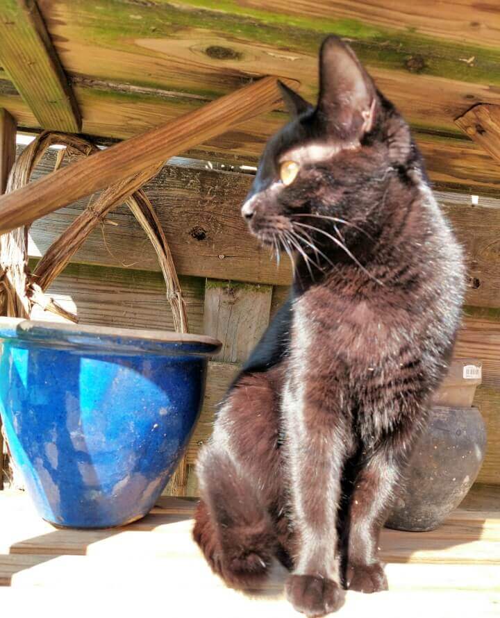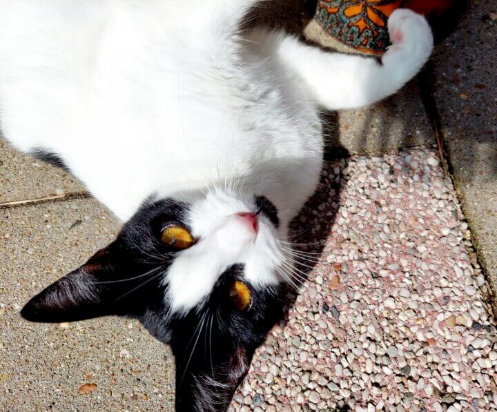 Helemaal slaapdronken keek hij in de tuin waar alle katten nieuwsgierig (en waarschijnlijk afgunstig) rond Knoepie stonden. Het was een dood muisje….