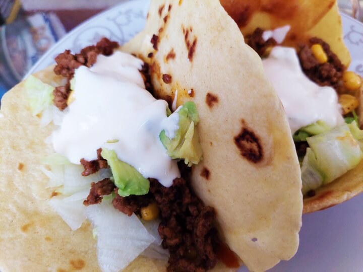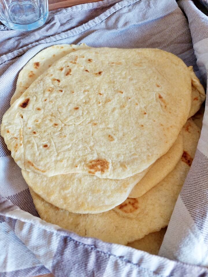 Ik zag een leuk recept voor tortilla’s. Je hebt alleen maar boter, bloem, water en baking soda nodig. Het is een kwestie van kneden, laten rijzen en in de pan opbakken.