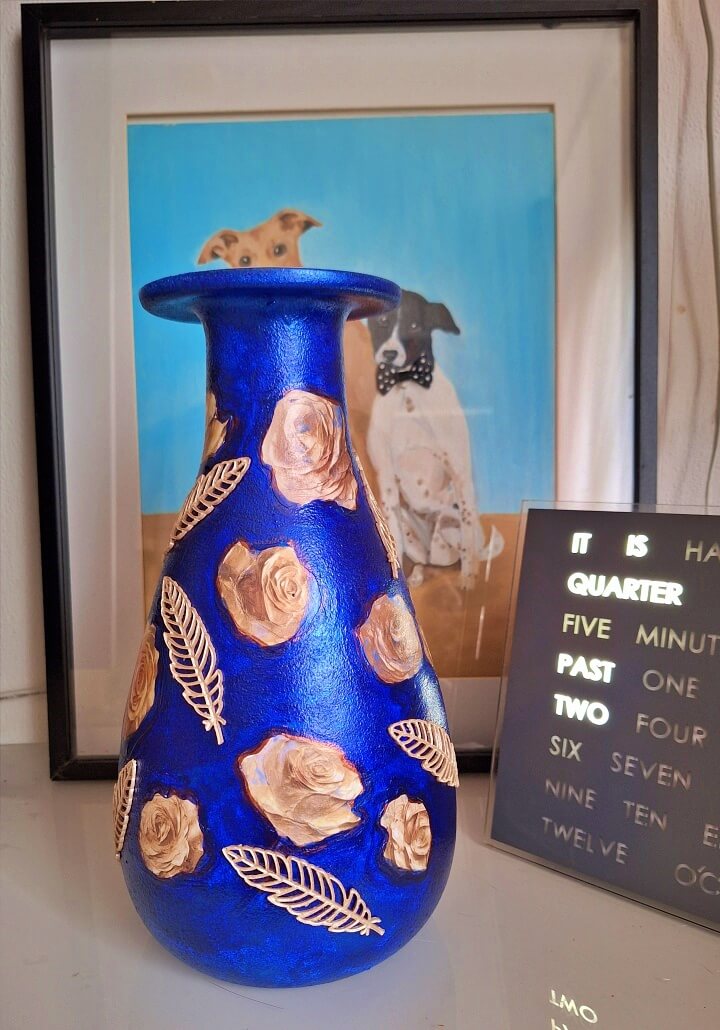 Een vaas beschildert en “bladeren van goud” erop geplakt.