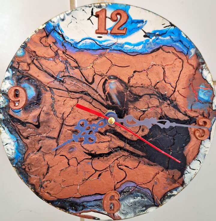 Deze ronde klok heb ik gemaakt door acrylverf te gieten.