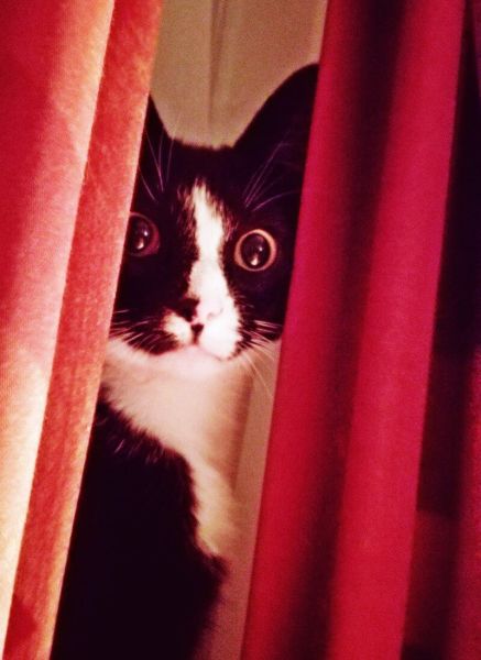 .Deze foto had ik genomen toen ik in bed lag en Toulouse koekeloerde door het gordijn naar mij. Vanuit een heel onhandige positie heb ik de foto met mijn smartphone gemaakt. En volgens mij was ik toen ook nog herstellende van die longontsteking.