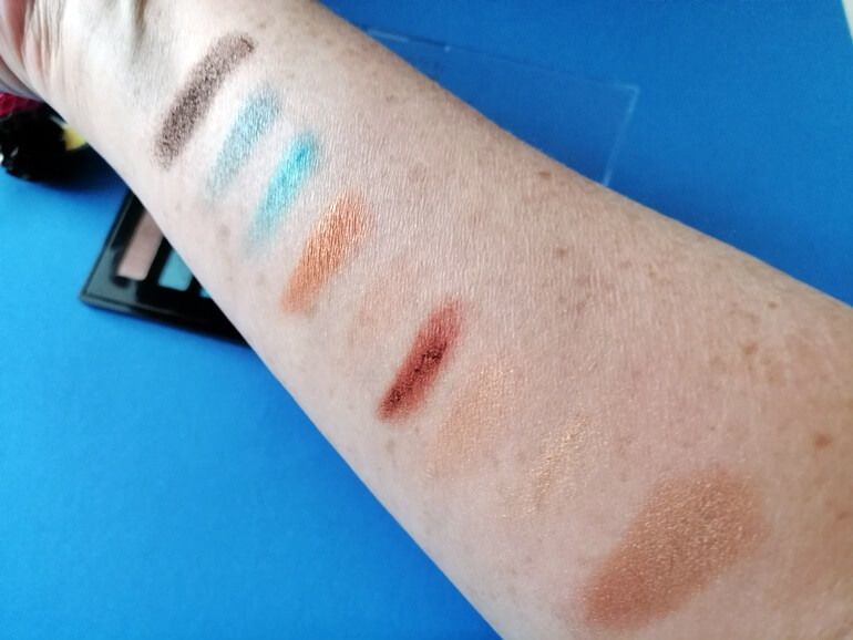 Zoals je op de swatches kan zien zijn de kleuren goed gepigmenteerd, alleen de laatste, lichtste kleur valt weg (die staat niet eens op de foto, is toch niet zichtbaar). Verder zien ze er schitterend uit. Weinig fall-out, de poeders zijn eerder ietwat creamy dan poederig en blenden prima uit.