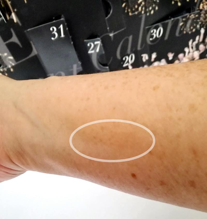Hieronder zie je dat ik een paar druppeltjes op mijn arm heb gedaan, deze uitgesmeerd en de dag erna heb ik deze foto gemaakt. Ik ga hem mengen met mijn dagcrème en eens kijken of mijn gezicht ook een mooie subtiele glow gaat krijgen!