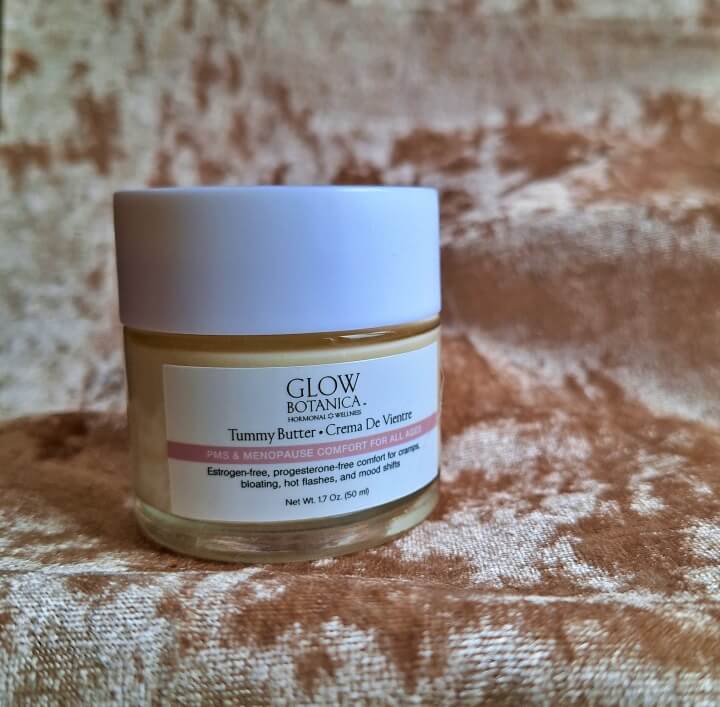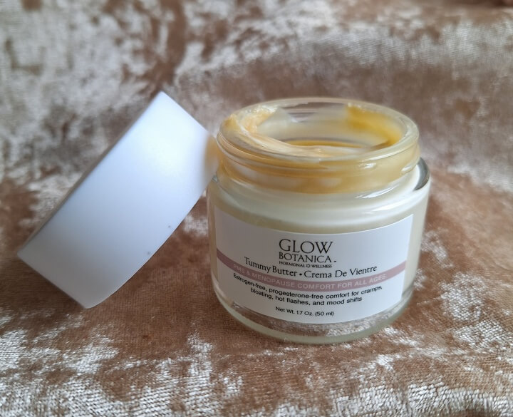 Tummy Butter van Glow Botanica is een supplementcrème ontwikkeld door farmacologen. Met micro-ingekapselde natuurlijke actieve stoffen biedt dit product verlichting bij PMS- en menopauze- ongemakken. De rijke en geruststellende formule absorbeert snel, verlicht krampen, een opgeblazen gevoel, opvliegers en stemmingswisselingen. Belangrijk is dat het een eenvoudige aanvulling is op uw huidige behandeling, vrij van oestrogeen, progesteron en hormoonontregelende chemicaliën.