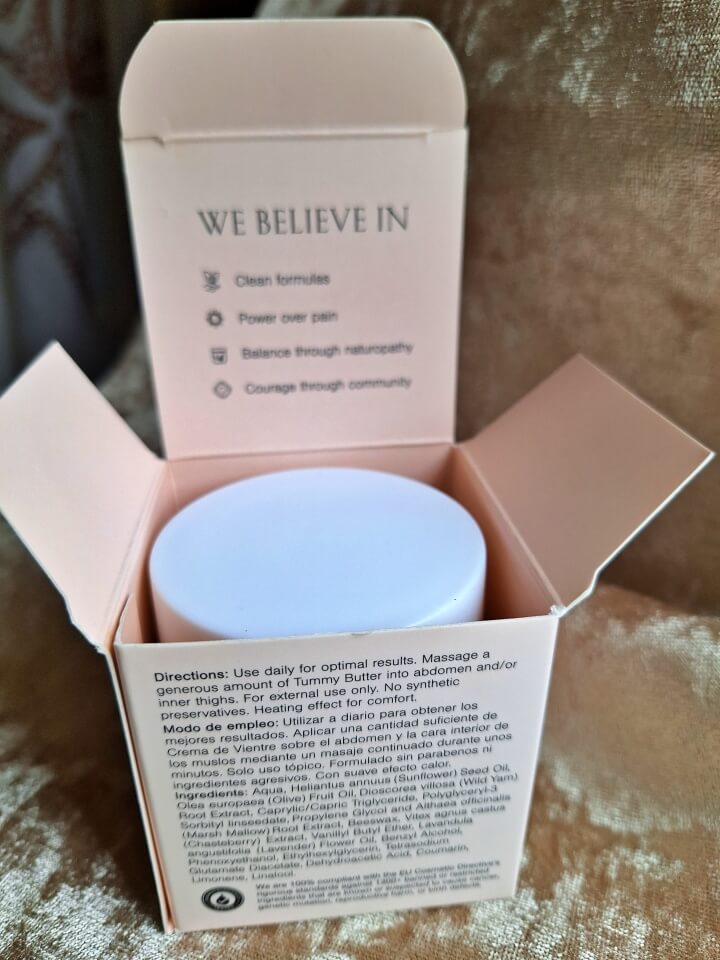 De Tummy Butter zit in een glazen pot en zodra je de deksel eraf draait ruik je een zalige, kruidige geur. De textuur is heel apart, een crème die voor mijn gevoel wat ook eigenschappen van een gel heeft en het voelt wat lobbig aan. De Tummy Butter blijft enigszins op de huid zitten, maar het plakt gelukkig niet. Je moet deze crème eigenlijk 30-60 dagen achter elkaar gebruiken, maar ik denk dat ik weinig kan melden over het effect. Wellicht wel als je in de menopauze zit, last hebt van PMS, endometriose en PCOS. Rond mijn vijftigste ging ik de menopauze in en gelukkig is dat allemaal achter de rug. Ik had last een opgeblazen gevoel en wat opvliegers, maar eigenlijk viel dat al met al mee. Het zweet kan mij nog steeds uitbreken, maar bijvoorbeeld een knalrood hoofd krijgen, dat kreeg ik gelukkig nooit.