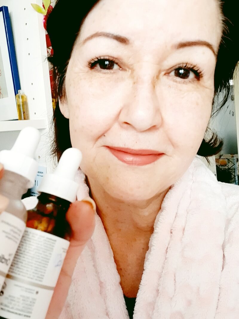 In de ochtend eerst een serum dan een crème en dan nog mijn tinted moisterizer. In de avond na de double cleanse ongeveer hetzelfde (wel andere producten) een serum, op het moment wissel ik mijn retinol af met een andere crème en dan nog een lekkere moisterizer erover heen. Kan nu wat meer retinol gebruiken omdat ik niet naar de schoonheidsspecialiste ga. Anders moet ik 14 dagen van te voren stoppen met retinol anders gaat het met waxen niet goed (dan trek je de huid stuk….)