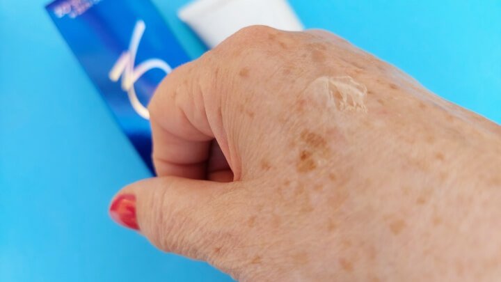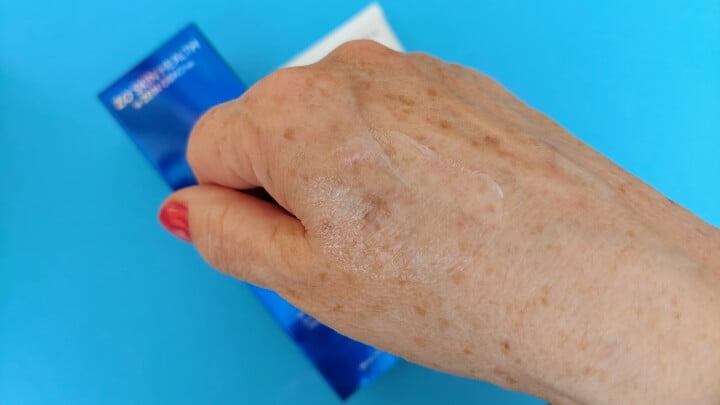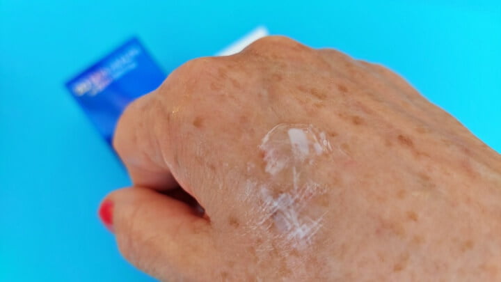 Je ziet dat het eerst een doorzichtige gel is, daarna veranderd de textuur in een milk. (ik heb het heel spaarzaam opgebracht, hoop dat je het een beetje kan zien op deze foto’s)